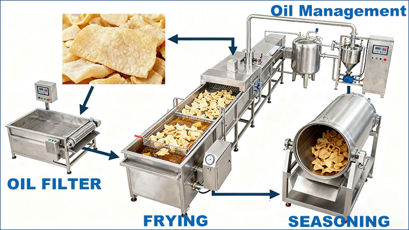 Preparación de la materia prima → Blanqueo → Secado → Freing continuo → Filtración de aceite & Deoiling → condimento → enfriamiento → empaquetado