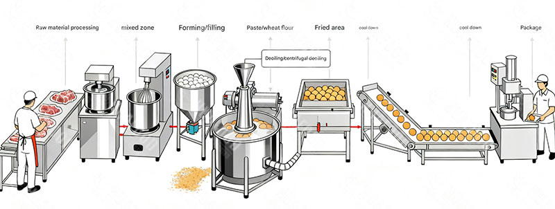 In short, this Automatic Croquettes Making and Frying Machine Production Line is a highly automated, modular, and energy-efficient system tailored for fried croquettes. It integrates the entire process, from raw material pretreatment, mixing, 成型, 面糊涂层, 连续油炸, de-oiling, 冷却, to packaging. Each step is precisely designed and coordinated.